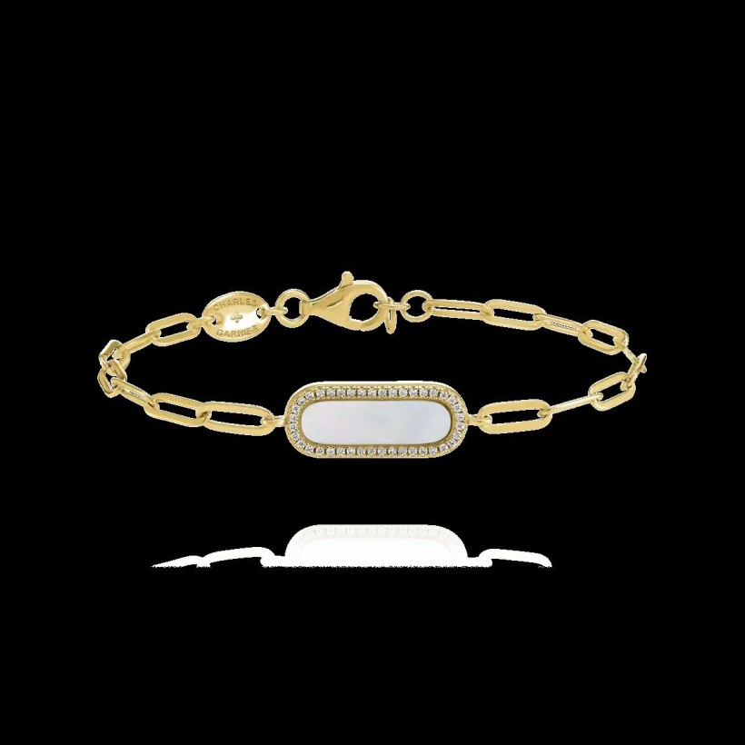 Ce bracelet en argent doré possède de fins maillons et un long maillon en nacre serti d'oxydes de zirconium. Ce bijou saura vous séduire par son style élégant et moderne.
