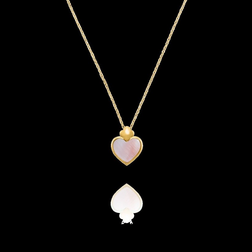 Douceur et romantisme définissent ce collier de la collection Passion, avec un pendentif cœur en nacre rose encadré d'argent doré.