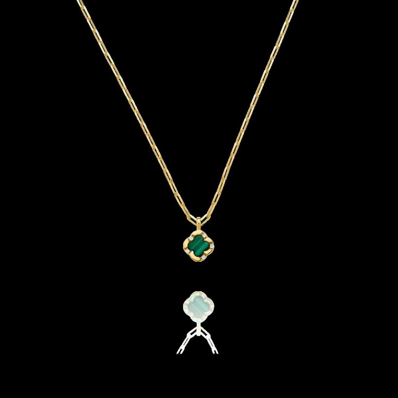 Apportez une touche colorée à votre tenue avec le Collier LÉGENDE Trèfle Malachite, une création en argent doré et oxydes de zirconium, sublimée par un pendentif en forme de trèfle. La malachite, pierre semi-précieuse aux nuances vertes profondes, symbolise protection et harmonie. Ce bijou aux accents luxueux sublimera votre féminité tout en vous offrant une aura de chance et d'élégance. Le Collier LÉGENDE Trèfle Malachite est un bijou intemporel, parfait pour la femme moderne en quête de lumière et d'harmonie.