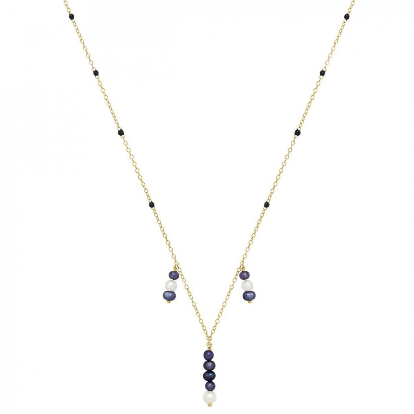 Collier 9 carats, Alliage d'or 375 Millièmes, CHARLES JOURDAN, Collection ARIA, multi minis perles noires, 3 pampilles perles blanches