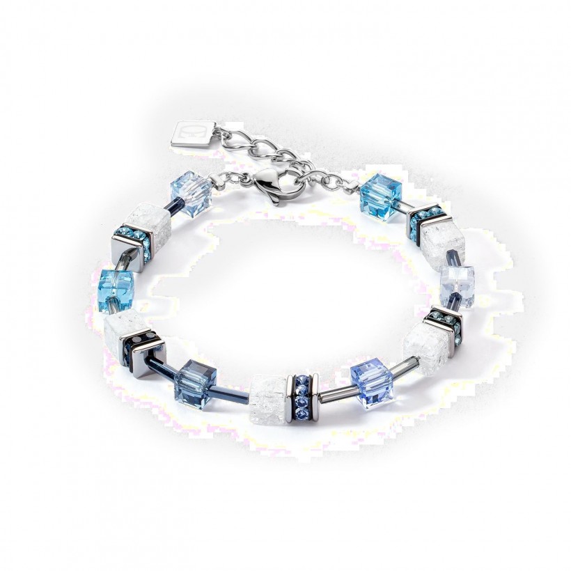 Celebrating the beauty of nature. Réalisé à la main en cristal de roche craquelé et scintillants cristaux Swarovski®, ce bracelet de la célèbre collection GeoCUBE® associe du cristal de roche aux vertus apaisantes à de froides nuances de bleu qui évoquent un ruisseau de montagne rafraîchissant.