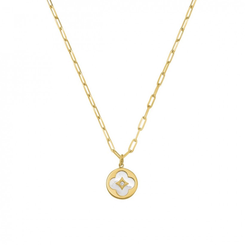 Arborant en son centre le trèfle Garnier en nacre blanche serti dans une médaille d'argent 925 doré, ce collier de fines mailles rectangulaires sublimera discrètement toutes vos tenues.