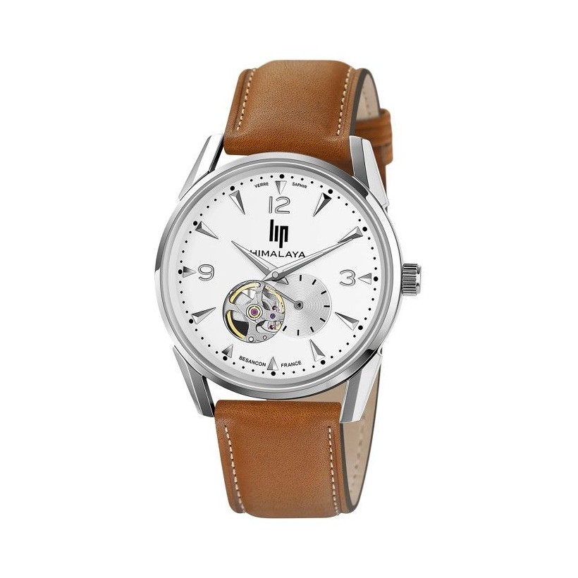 La fiabilité et la résistance du modèle Lip Himalaya ont fait sa renommée. L'Himalaya, garde-temps à l'élégance intemporelle, vit désormais au rythme d'un mouvement automatique. Le cœur battant permet d'admirer la mesure du temps qui passe avec précision et élégance. Le boîtier en acier inoxydable 316L poli et brossé est plus imposant que lors de son lancement en 1954, il mesure à présent 40 mm de diamètre et offre un fond transparent vissé, permettant d'admirer le mécanisme automatique embarqué. Le cadran blanc légèrement argenté dévoile des index triangulaires argentés et des aiguilles des heures et des minutes argentées en partie luminescentes, il est recouvert par un verre saphir traité antireflet. Le compteur des petites secondes à 4h présente une aiguille argentée.