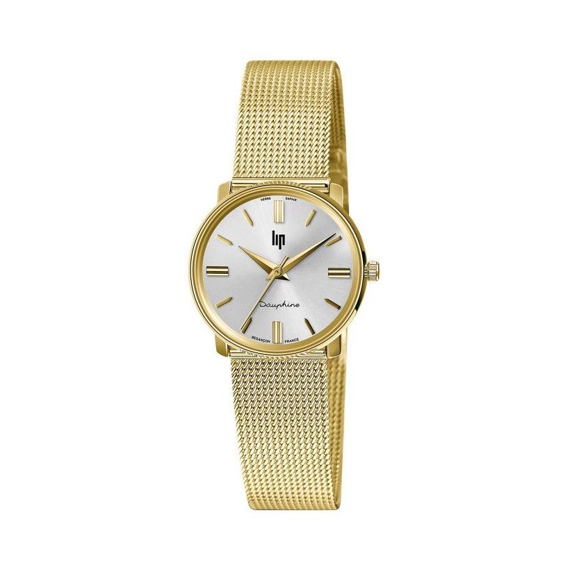 La collection Lip Dauphine est déclinée avec ce diamètre de boîtier en 29 mm, mais toujours dans un esprit minimaliste et vintage avec des proportions discrètes qui accentuent son élégance et raffinement. Une boîte dorée montée sur un bracelet en mailles milanaises, ajustable, doré muni d'un fermoir style charriot pour un ajustement facile et précis. Son cadran soleillé blanc légèrement argenté est parcouru par des aiguilles dorées et recouvert d'un verre saphir bombé traité antireflet ; ce modèle quartz 3 aiguilles saura se faire remarquer par son éclat.