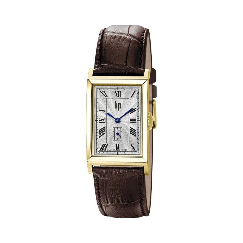 Cette création LIP T24 est une réinterprétation du modèle à quartz "Churchill". Son charme réside avant tout dans son boîtier de forme rectangulaire de 24 mm de large en acier inoxydable 316L doré, brossé et poli. Son magnifique cadran accueille des chiffres romains et des aiguilles bleues. Son bracelet en cuir marron revêt un motif crocodile et s'attache avec une boucle ardillon. Une montre intemporelle qui saura attirer tous les regards.