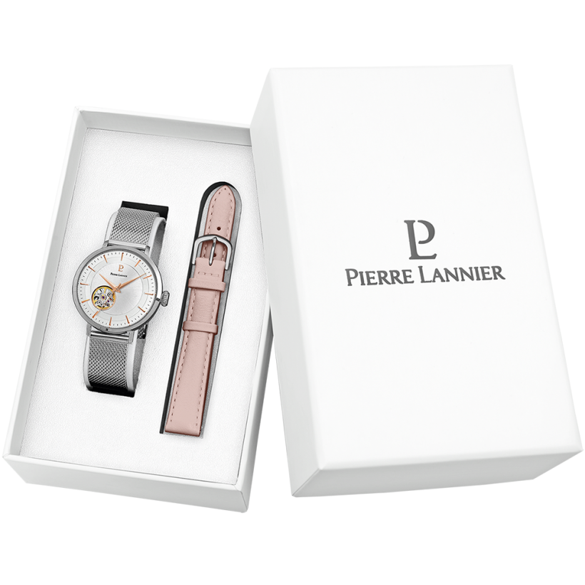 Coffret Pierre LANNIER, Dame, Montre automatic bracelet milanais, coeur ouvert, bracelet interchangeable