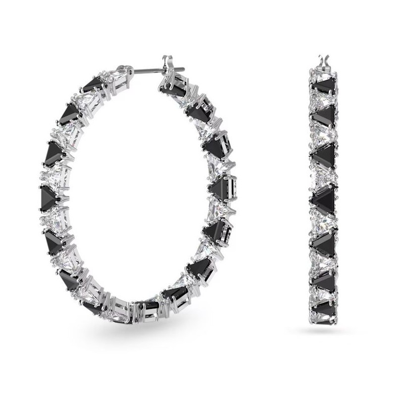Une mosaïque de pierres noires et blanches taille triangle a été conçue pour cette paire de créoles en métal rhodié. Le fermoir subtil offre un effet 360° et les pierres délicatement taillées sont éblouissantes sous tous les angles. Portez-les sur un col roulé ou sur des épaules dénudées, à n'importe quelle heure de la journée. Pensées par la directrice de création Giovanna Engelbert pour la Collection III, ces boucles d'oreilles font partie de la famille Millenia.