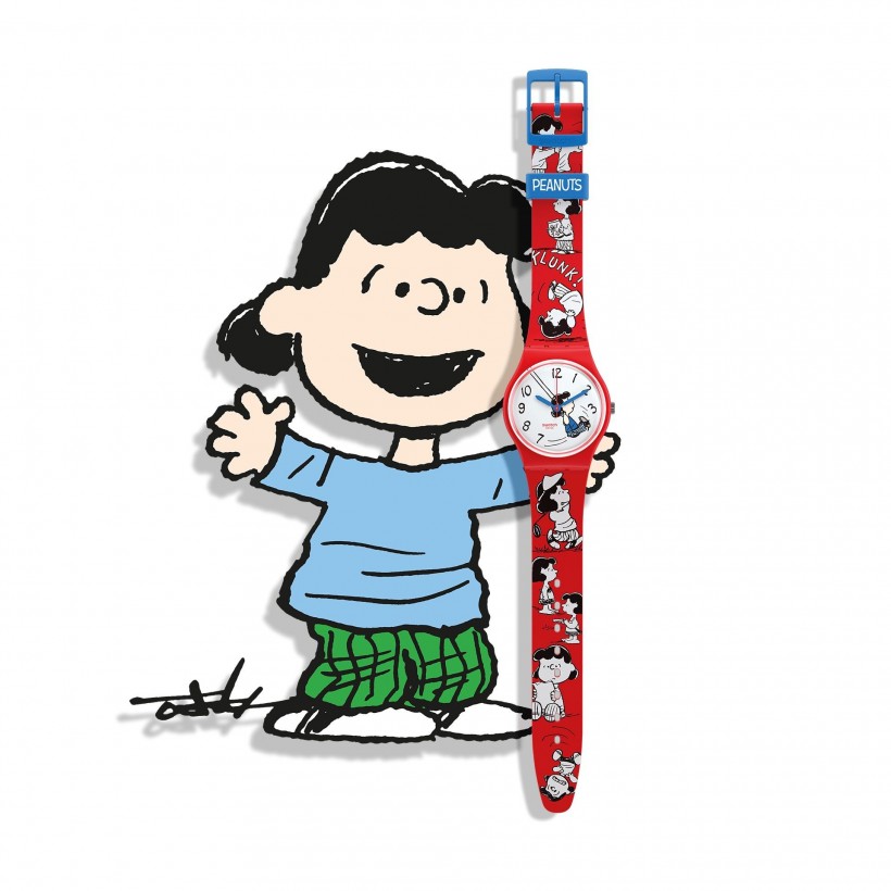 Pour cette montre Swatch X Peanuts Lucy Van Pelt, le solide bracelet en silicone rouge mat et le boîtier en matériau biosourcé créent un contraste audacieux avec l'imprimé Lucy intégral noir et blanc du bracelet. La robuste boucle en silicone bleu mat imprimée et le fermoir en plastique bleu mat résistant ajoutent la touche finale pour faire de cette pièce une éclatante montre Peanuts.