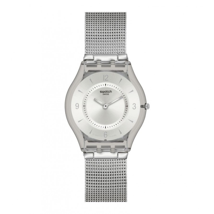L'ultra-fine METAL KNIT (SS08K100M) dispose d'un bracelet milanais réglable en acier inoxydable assorti à son cadran brossé argenté.