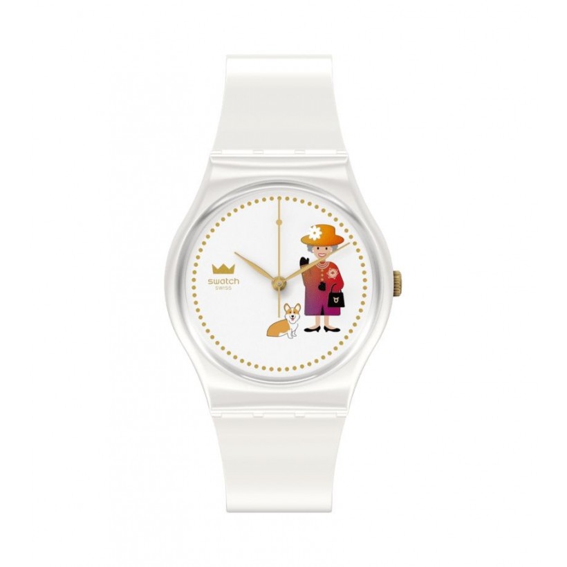 Dotée d'un cadran transparent avec un imprimé blanc et or, cette Gent affiche 70 points dorés en guise d'index pour marquer les 70 ans de règne de la Reine. L'atout principal de cette montre est la roue du calendrier : chaque jour, elle change de couleur en même temps que la tenue de la Reine. Cette montre est complétée par un boîtier blanc mat et un bracelet en silicone à effet Anodamazing. Une surprise est également inclue avec son packaging spécial: une couronne étincelante en papier argenté.
