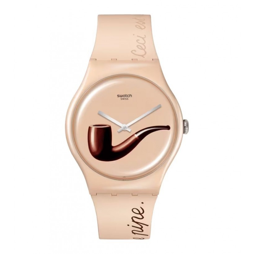 LA TRAHISON DES IMAGES BY RENÉ MAGRITTE reprend des détails de l'œuvre emblématique La Trahison des images de l'artiste surréaliste René Magritte _ qui est imprimée sur le cadran multicolore de la montre. Le devant du bracelet joue avec la nature surréaliste de l'œuvre avec la phrase « Ceci n'est pas une pipe. Ceci est une Swatch. ». En outre, le nom de l'artiste est imprimé sur le passant. La Trahison des images (1929), oil on canvas, 60 x 81 cm (Los Angeles County Museum of Art - Inv. 78.7.) © Succession René Magritte - SABAM, Belgium, 2023 /