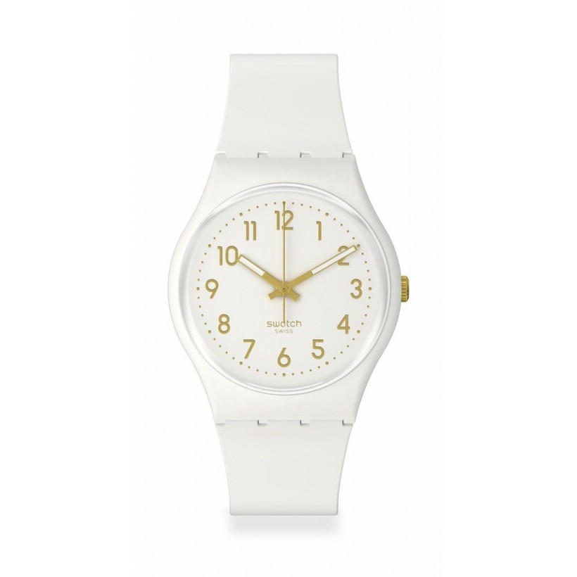 Cette élégante montre possède un cadran blanc doté de chiffres arabes dorés et d'aiguilles phosphorescentes ainsi que d'un bracelet blanc minimaliste. Cette montre intègre la fonction SwatchPAY!