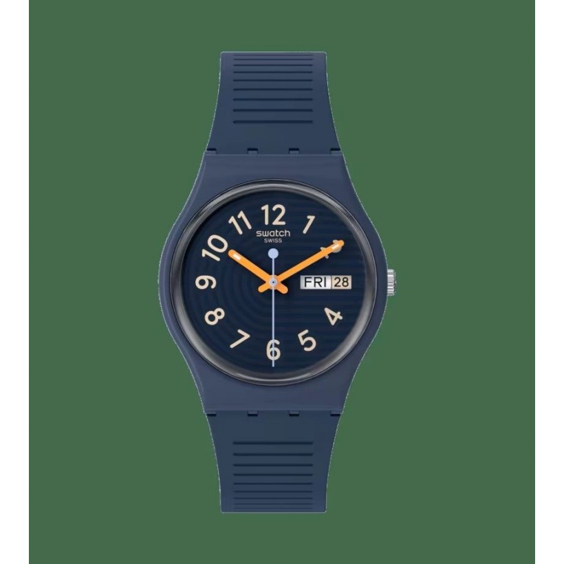 Le cadran de cette montre bleu foncé possède des chiffres imprimés beiges dans un boîtier doté d'un verre le tout biosourcé. Les aiguilles brillent dans le noir tandis qu'un guichet date se trouve à 3 heures. La boucle, le bracelet et le passant bleu foncé assortis créent un effet ton sur ton étonnant.