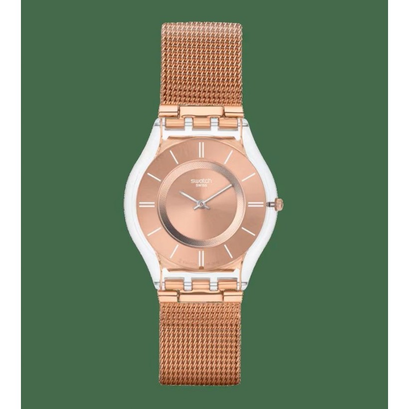 Cette montre ultrafine possède un cadran brossé soleil couleur or rose décoré d'index blancs et d'aiguilles des heures et des minutes argentées. Son boîtier transparent brillant biosourcé est surmonté d'un verre également biosourcé. Le bracelet en maille d'acier inoxydable ajustable offre une finition PVD couleur or rose d'une grande élégance.