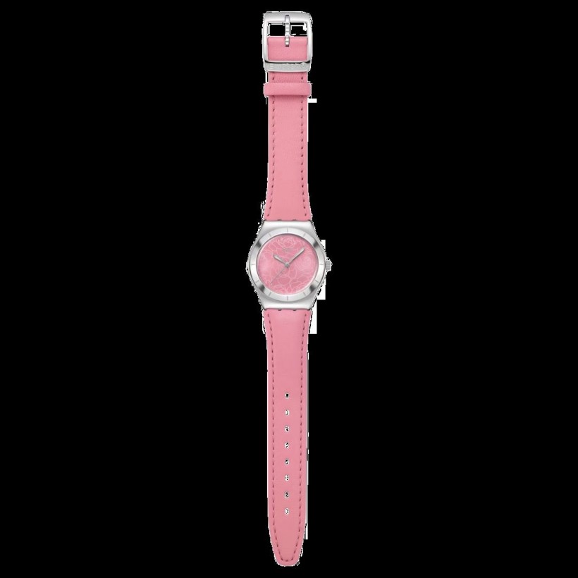 Cette élégante montre en acier inoxydable possède un cadran brossé soleil rose au motif fleuri blanc, des aiguilles des heures et des minutes argentées qui brillent dans le noir et une aiguille des secondes argentée. Le boîtier en acier inoxydable poli est assorti d'une lunette coordonnée avec des index gravés. Un bracelet en cuir rose avec des surpiqûres assorties, accompagné d'un passant en cuir rose et d'une boucle en acier inoxydable poli, complète l'ensemble.