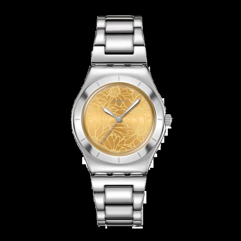 Cette élégante montre en acier inoxydable possède un cadran brossé soleil jaune au motif fleuri jaune clair, des aiguilles des heures et des minutes argentées qui brillent dans le noir et une aiguille des secondes argentée. Le boîtier en acier inoxydable poli est assorti d'une lunette coordonnée avec des index gravés. Un bracelet en acier inoxydable poli fermé d'une boucle papillon complète l'ensemble.