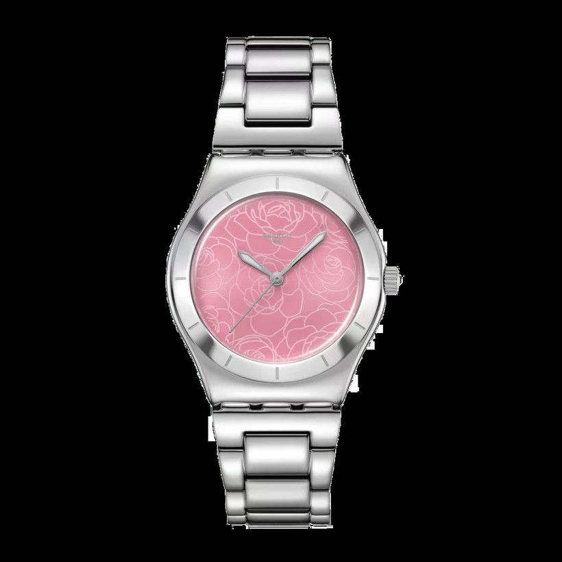 Cette élégante montre en acier inoxydable possède un cadran brossé soleil rose au motif fleuri blanc, des aiguilles des heures et des minutes argentées qui brillent dans le noir et une aiguille des secondes argentée. Le boîtier en acier inoxydable poli est assorti d'une lunette coordonnée avec des index gravés. Un bracelet en acier inoxydable poli fermé d'une boucle papillon complète l'ensemble