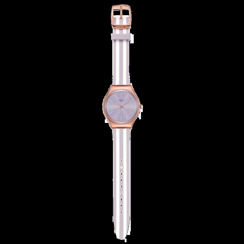 Cette montre ultra-fine possède un cadran violet clair avec un fini brossé soleil, un réhaut violet clair, une minuterie et des index imprimés blancs, ainsi que des aiguilles des heures et des minutes couleur or rose qui brillent dans le noir. Le boîtier et la boucle en acier inoxydable brillant avec revêtement PVD couleur or rose s'accompagnent d'un bracelet mat rayé violet clair et blanc à passant mat violet clair.