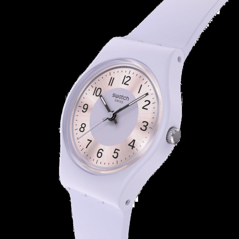 Cette petite montre possède un cadran brossé soleil rose décoré d'un rond violet clair au centre, ainsi que de chiffres et d'une minuterie vert foncé _ tous imprimés. Les aiguilles des heures et des minutes vert foncé qui brillent dans l'obscurité et l'aiguille des secondes violet clair indiquent l'heure. Le boîtier mat violet clair s'associe à un bracelet mat dégradé violet clair et rose clair, avec une boucle et un passant mats rose clair.