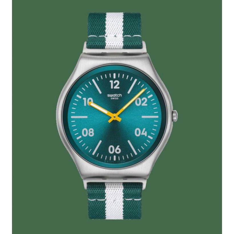 Cette montre ultra-fine possède un cadran vert avec un fini brossé soleil, un réhaut vert, une minuterie, des index et des chiffres imprimés blancs, ainsi que des aiguilles des heures et des minutes jaunes qui brillent dans le noir. Le boîtier, les passants et la demi-boucle en acier inoxydable sablé s'accompagnent d'un bracelet textile rayé vert et blanc.