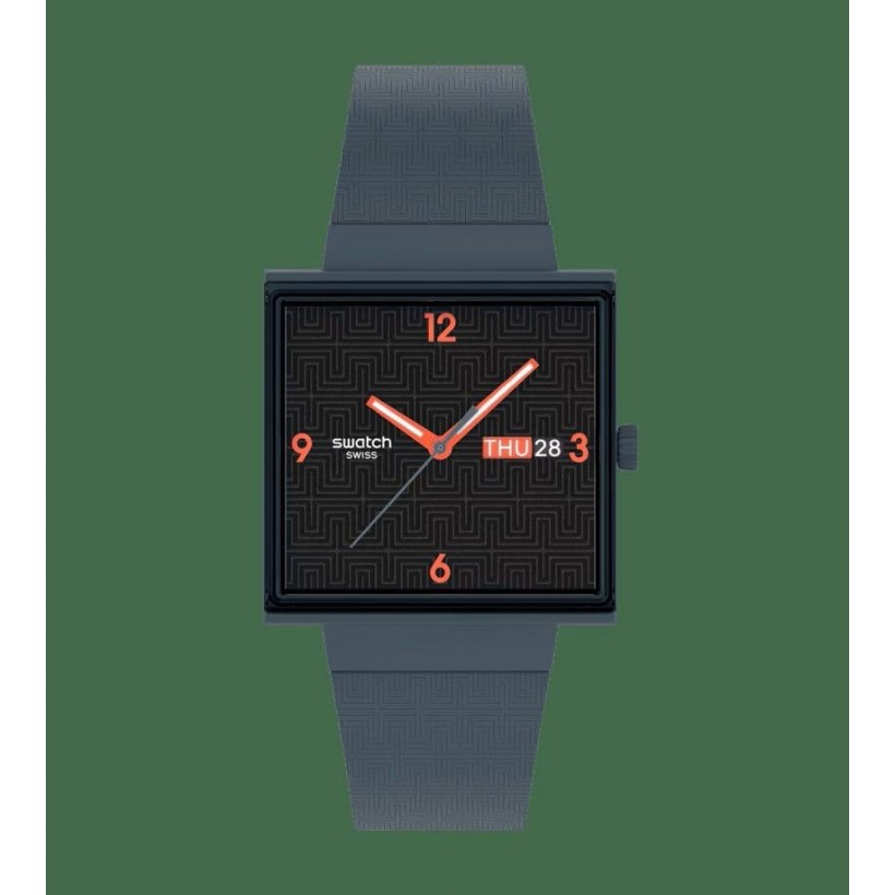 Cette montre présente un boîtier carré gris foncé mat en biocéramique avec un verre biosourcé bord à bord qui donne une vue latérale sur le cadran noir texturé. Le cadran est doté de chiffres imprimés en orange, d'aiguilles des heures et des minutes orange qui brileant dans le noir, d'une aiguille des secondes gris foncé et un guichet de date à 3 heures. Un bracelet texturé gris foncé mat avec un passant gris foncé mat et une boucle en biocéramique gris foncé mat complète la montre.