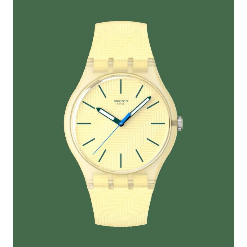 Cette montre est dotée d'un cadran jaune clair texturé avec des chiffres imprimés en vert foncé, d'aiguilles des heures et des minutes vert foncé qui brillent dans le noir et d'une aiguille des secondes bleue dans un boîtier biosourcé jaune clair mat transparent avec du verre biosourcé. Un bracelet texturé jaune clair mat avec un passant et une boucle jaune clair mat transparent complète la montre.